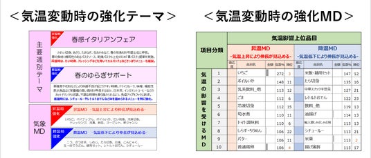 日本気象協会協力のもと、2021~2024年のPOSデータ実績の気象感応度を解析することで、「気温が上がれば売れる昇温MD」「寒くなるほど売れる降温MD」を抽出しました。