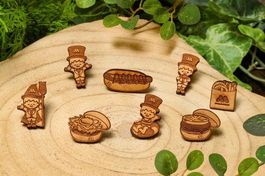 モスフードサービスのコーポレートキャラクター「リルモス」と、モスバーガーのハンバーガーなどをデザインした、未利用間伐材から作られたピンバッジです。リルモスのデザイン4種から1つを組み合わせた、4セットの中からお選びいただけます。