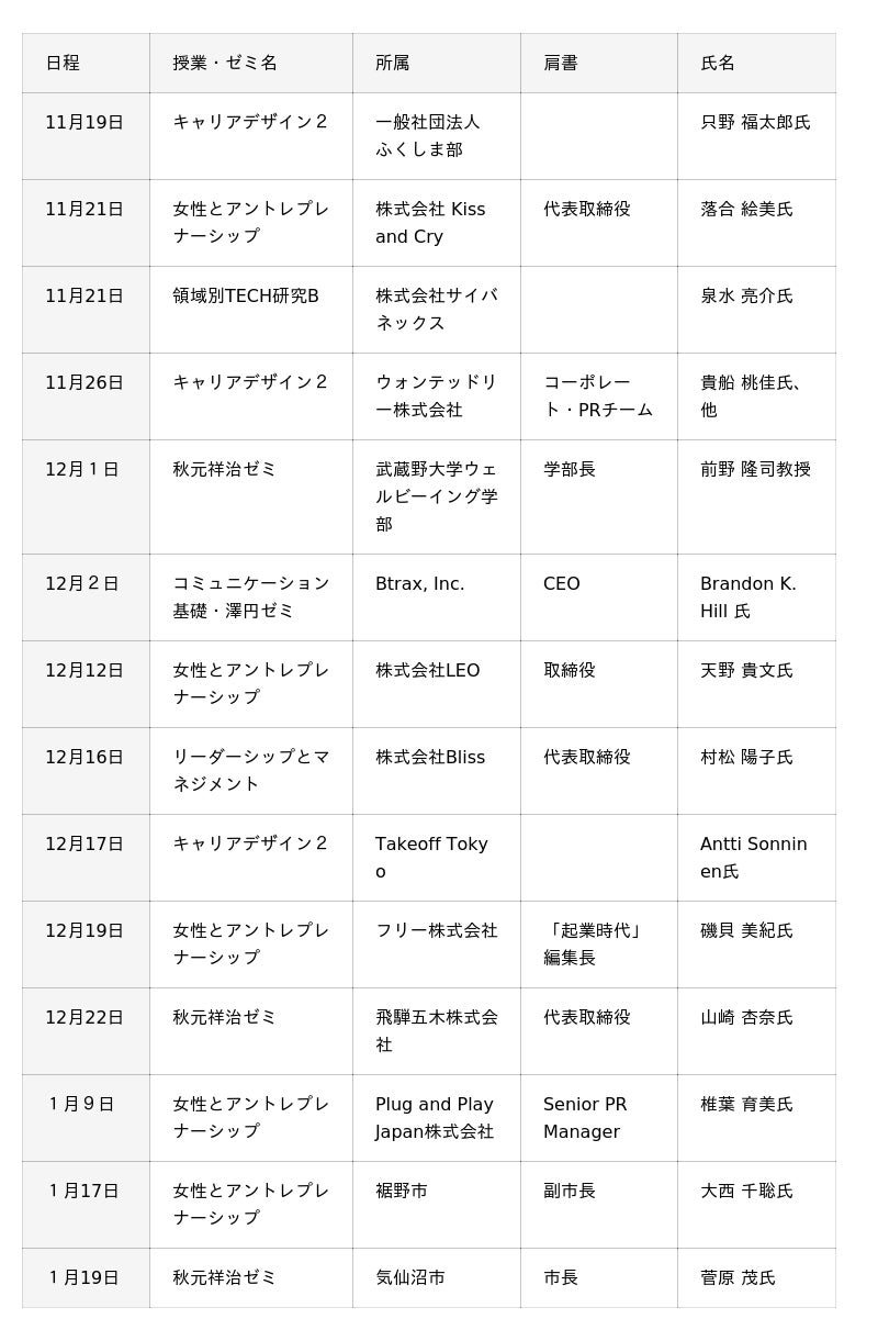 本学では4学期制をとっており、4学期は以下のみなさまがゲストとして登壇予定です(一部実施