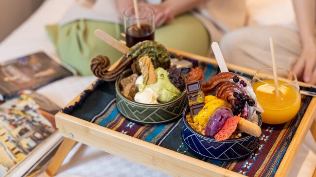 ESTINATE HOTEL 那覇では、3種類の見た目も可愛い“チュロポップ&ジェラート”を新しく販売いたします。チュロポップとはロリポップキャンディー型のチュロスのこと。ESTINATE HOTEL 那覇ではホテルのデザインでもあるヤマネコのしっぽをイメージしたチュロポップにアレンジしました。味は安納芋&紅芋とトロピカルフルーツ、抹茶の3種類。「安納芋と紅芋」は紅芋と安納芋のジェラートに紅芋ソースと安納芋を乗せて、ナッツの食感やシナモン味のチュロスが良いアクセントの秋らしい芋づくしに。「トロピカルフルーツ」はマンゴーとブルーベリーのジェラートにパッションフルーツソース、ラズベリー味のチュロスをのせた沖縄の美味しいをつめ込んだ一皿。「抹茶」はバニラと抹茶のジェラートにわらび餅、あんこをトッピング。チュロスも抹茶味でお茶の渋みが絶妙な味わいに仕上げました。