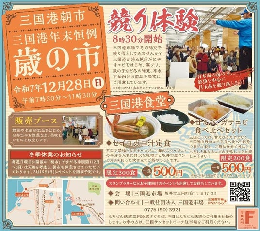 越前がにの水揚げ港で知られる福井県坂井市の三国港市場で、今年最後の日曜の12月28日早朝、三国港朝市恒例の「歳の市」が開かれる。12月末で禁漁となるズワイガニの雌のセイコガニが最後の販売となるのをはじめ、雄のズワイガニ、カズノコ、カレイ、バイ貝などずらり冬の味覚が販売ブース店頭を飾る。また来場者がカニなど海産物を競り落とすことができる「競り市体験」もある。三国港食堂ではセイコガニの半身が入った「セイコガニ汁」や特産の甘エビと地元で“幻のエビ”とされるガザエビの食べ比べセットなどのメニューも用意され、年の瀬を飾るにぎやかな海鮮市となりそうだ。