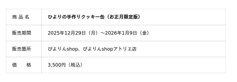 ジェイアール東海フードサービス株式会社(本社:愛知県名古屋市、代表取締役社長:岩下賢一)は、オリジナルスイーツ「ぴよりん」をモチーフにした「ひよりの手作りクッキー缶」のお正月限定版を、2025年12月29日(月)より販売いたします。松・竹・梅をかたどった縁起の良いクッキーや、緑茶・いちごなど和のテイストを取り入れた全9種類のクッキーを、ひとつひとつ丁寧に手作りで詰め合わせました。新年のご挨拶や贈り物にもふさわしい、華やかで特別感あふれるお正月限定のクッキー缶です。
