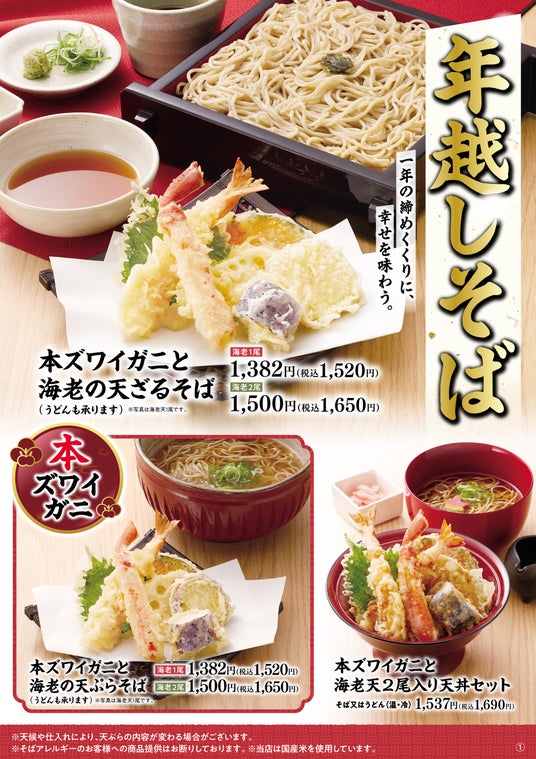 家族亭では、皆様に一年の締めくくりに特別な年末を過ごしていただく為に、年越しそば「本ズワイガニと海老の天ざる」をご用意いたしました。天ざるの他にも「本ズワイガニと海老の天ぷらそば」や「本ズワイガニと海老天2尾入り天丼セット」もご用意しております。