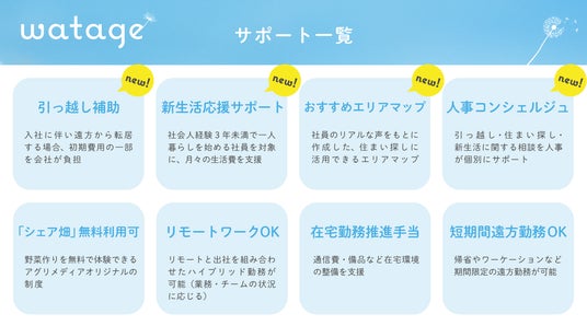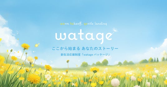 watageは、入社を機に新しい環境へ飛び込む社員の暮らしを支える8つのサポートを束ねたパッケージです。たんぽぽの綿毛が新しい土地へ飛び、根を張り、芽を伸ばし、花を咲かせていく姿をモチーフに、未知の環境に一歩を踏み出す社員にそっと寄り添い、成長を支える存在でありたいという想いを込めています。名称は、warm takeoff, gentle landing(あたたかく飛び立ち、やさしく着地する)というコンセプトに着想を得ています。