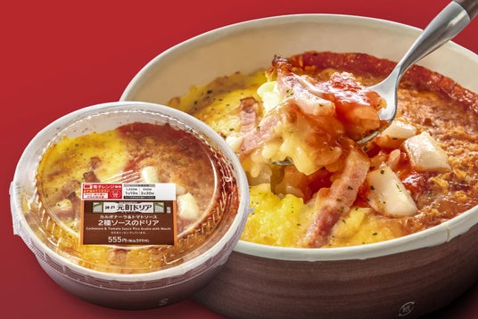 「神戸元町ドリア」では、「ドリアの専門店」として常時 30 種類以上のドリアメニューを販売しております。「2種ソースのドリア」は神戸元町ドリアの人気商品「カルボナーラ風ドリア」と「BMTドリア(ベーコン・もち・トマト)」をハーフ&ハーフ仕立てで仕上げました。濃厚クリームのカルボナーラと、程よい酸味のトマトソースの2つの味を一度に楽しめる商品です。
