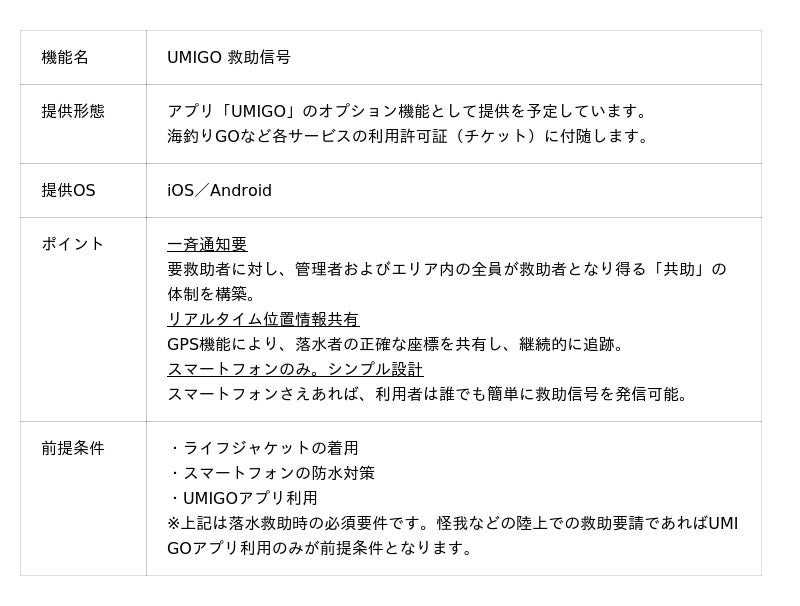 「UMIGO 救助信号」は、落水などの緊急事態が発生した際に、スマートフォンアプリ内の「救助信号を発信」ボタンをタップすることで、運営管理者およびエリア内のサービス利用者全員に対して一斉に救助要請を発信できるシステムです。発信後は位置情報が随時更新され、受信者はマップを頼りに救助活動を開始することが出来ます。海業アプリ「UMIGO」のオプション機能として提供を予定しており、運営管理者は信号を受け取った時点で、緊急連絡先を含む利用者情報も同時に参照することができます。