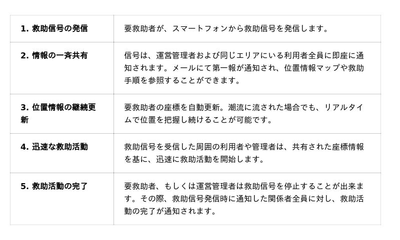 UMIGO 救助信号は、スマートフォンからボタンタップで救助信号を発信し、救助までの時間を大幅に短縮し救命率向上に貢献します。管理者のみならず同エリア内の利用者にも同時に信号を発信することにより共助の体制を構築できることが強みです。これによりサービス関係者間での一次救助体制を構築することができ、海上保安庁などの公的インフラへの依存度も下がります。一方で、UMIGO救助信号は完璧な安全対策を保証するものではありません。落水時に気絶した場合や、スマートフォン水没時は信号を発信することはできません。しかしながら、ベースとなる安全対策レベルを高めるという観点に立つならば、「UMIGO救助信号」は従来の課題を大幅にカバーすることができる、これまでになかった概念といえます。