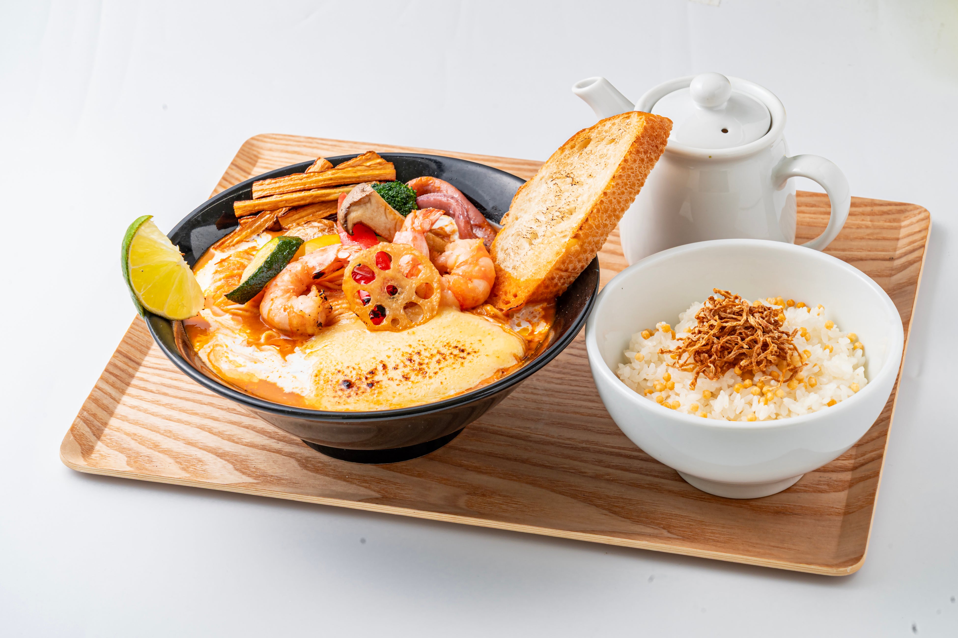 「エビ味噌出汁」と「とっておきのらぁリゾ」が付いたセット商品。残ったスープに「エビ味噌出汁」を加えて、「とっておきのらぁリゾ」にかけて和洋折衷のとっておきな味わいでお召し上がりいただけます。