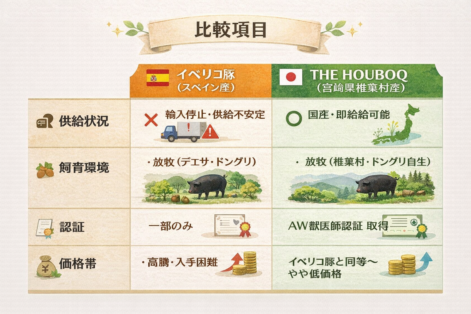 輸入停止となったイベリコ豚と、当社のTHE HOUBOQの比較は以下の通りです。単なる代替ではなく、「国産への構造転換」の選択肢として提案します。