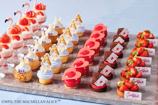 気まぐれで優雅な“フラミンゴ”を乗せたいちごといちご尽くしのヴェリーヌや、愛すべきいたずらっこ“三月ウサギ”を表現したシュークリーム、帽子屋の大きなシルクハットイメージのショコラケーク、ハートの女王の判決のように鋭く尖ったハート型のショコラを飾り付けた真紅のいちごムース、物語の主人公「不思議の国のアリス」のブルーのドレスを生クリームで表現したカップケーキ、瑞々しい甘さが広がる真っ赤ないちごのタルトの6種のスイーツをご用意。