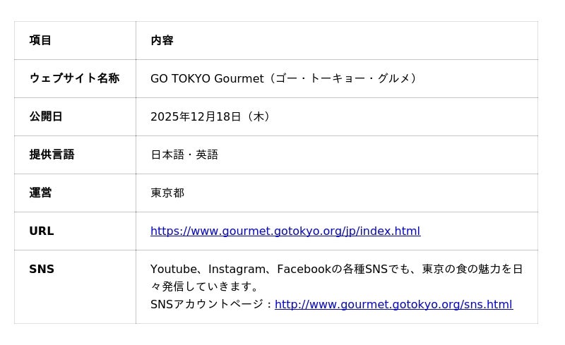 東京都は、国内外の旅行者に向けて、東京の多彩な食の魅力を発信するウェブサイト「GO TOKYO Gourmet(ゴー・トーキョー・グルメ)」を2025年12月18日(木曜日)に公開します。(https://www.gourmet.gotokyo.org/jp/index.html)