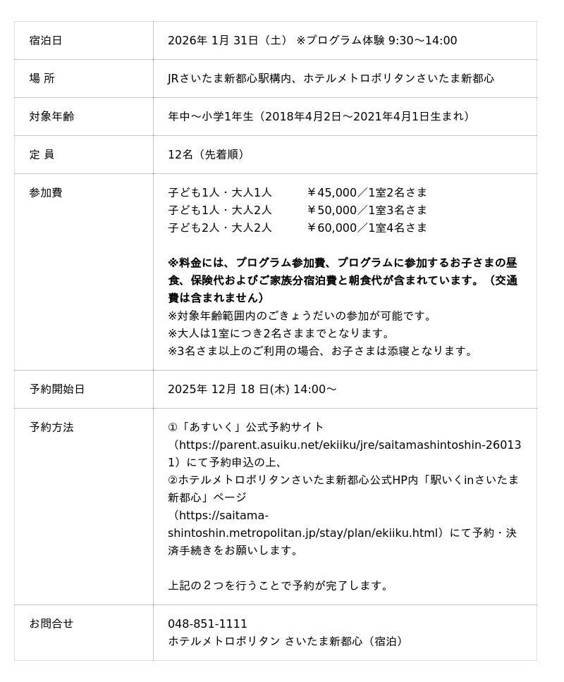 一時保育検索・予約サービス「あすいく」を運営する株式会社あすいく(代表取締役:幸脇啓子)、JR 東日本スタートアップ株式会社(代表取締役社長:柴田裕)、東日本旅客鉄道株式会社大宮支社(執行役員大宮支社長:石井剛史)、日本ホテル株式会社ホテルメトロポリタンさいたま新都心(総支配人:櫻井浩一)は連携して、「駅いく in さいたま新都心駅員&ホテリエ職業体験・自由時間ステイ」を