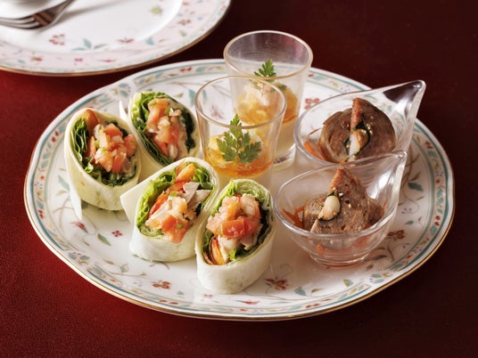 玉葱のブランマンジェ 柚子ジュレ/豚肉と海老のバロティーヌ キャロットラぺ/鶏ハムのトルティーヤ サルサソース