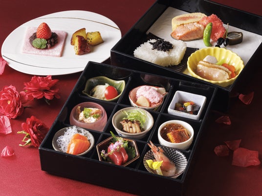 35階スカイレストラン「丹頂」では、九つの前菜を宝石のように散りばめた季節の二段重をご提供します。レストラン&バー「SKY J」では、赤をアクセントにした一品や、じっくりと火を入れたロースト料理、煮込み料理のほか、苺やチョコレートを使ったスイーツが並ぶブッフェをお楽しみいただけます。