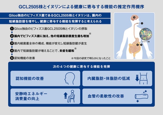 - よってGCL2505株とイヌリンによる認知機能の改善効果は、腸内で短鎖脂肪酸産生菌を増やすことで短鎖脂肪酸量が増えた結果、炎症が緩和されることによって発揮されることが示唆されました。