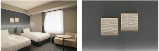 ツインスタンダードルーム(全51室)には廃棄予定だった北海道産ホタテの貝殻を粉末化し、サステナブル素材として活用したアート作品「札幌の雪」を設置しています。