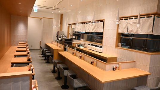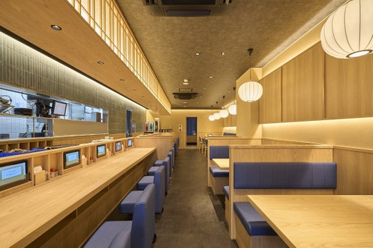 店舗デザインにおいては、シンプルに和を表現したモダンなデザインでお食事への新たな期待感を演出します。入口からの店内の視認性を向上、お食事の時間の快適さと心地良さを上げるためテーブルサイズ・カウンター席の間隔の見直し、ファミリーなどグループにも対応できるベンチシートやBOX席などを設置。さらに和を意識した素材の照明やテーブルの自然な木目の温かみで、落ち着きと親しみを感じていただけるデザインとしました。