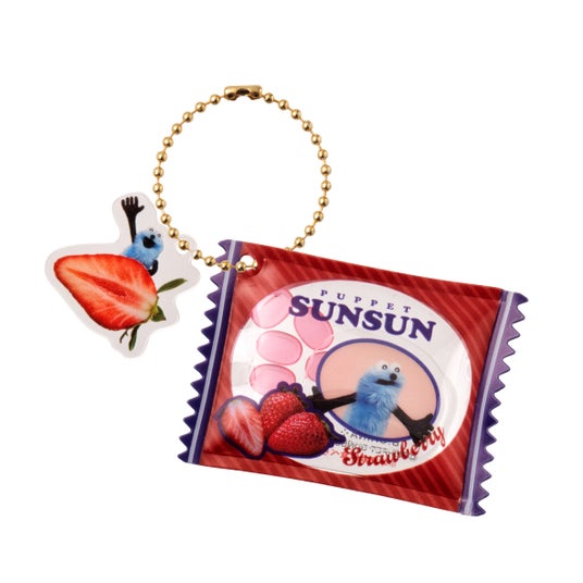 振るとシャカシャカ音がするキャンディパッケージ風のチャームが登場。スンスンたちがフルーツからひょっこり顔をだしているチャームも付いたダブルスイングです。