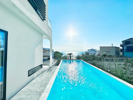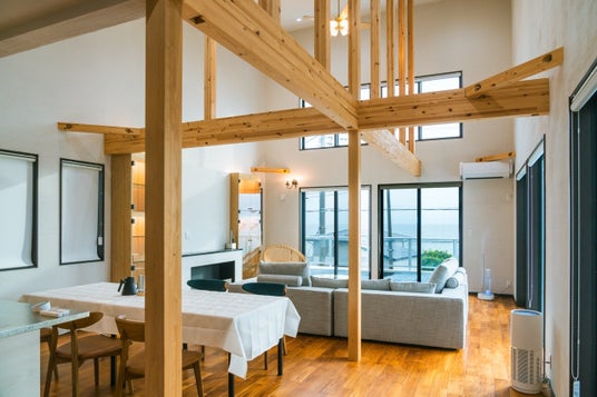 吹き抜けと梁見せ天井による開放感あふれる空間に、31.5帖の広々としたLDKを配置。テラスには9m×3.5mのプールを備え、海と空を借景に、家族や友人と特別な時間を楽しめます。