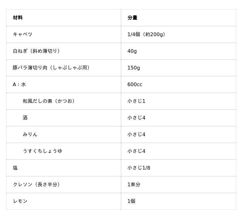 ・水からつくる鍋料理レシピ「たっぷりキャベツと豚肉のレモン鍋」
