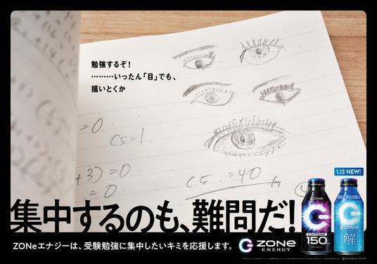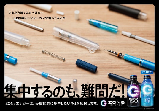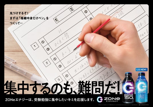 受験は試験本番に向けて、長期間にわたり勉強する日々が続きます。そのような中で、ときに集中が途切れてしまい、何気なく意味のないことをして時間が経ってしまうという経験は、誰しもあるはず。「ZONe ENERGY」は、そんな瞬間に着目した交通広告を掲出することで、受験勉強と向き合う方々を応援します。■「集中するのも、難問だ。」応援広告内容
