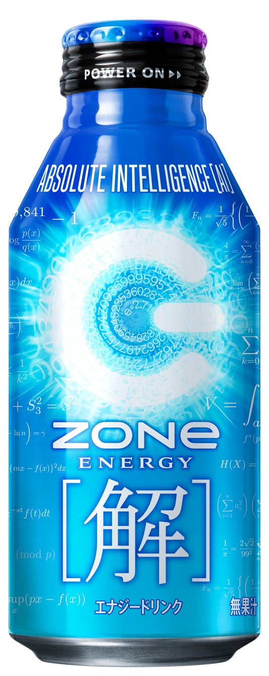 「ZONe ENERGY [解]」は、受験や勉強に向き合い、不確実な日々の中、答えを探し求めているすべての方々に無敵の[解]を授けるエナジードリンクです。従来の熱を帯びた受験応援とは異なる商品をお届けできればと思い、受験期に解を求めてAIを駆使し、スマートに勉強に臨む方が多いことに着目し、開発しました。正面には、答えを示唆するような大きな[解]をあしらい、缶上部に“Absolute Intelligence [AI]”と記載。また、クリアなブルーの背景に、無敵の[解]にちなんだ数式をらせん状に配することで、全体的にスマートさを感じられるデザインに仕上げました。
