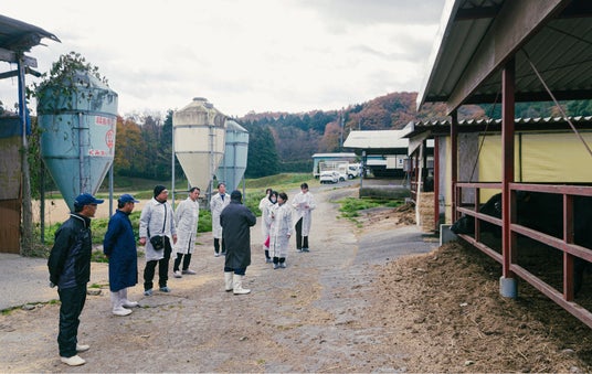 訪問先の「池田農場」で出迎えてくれたのは、美土里耕産 代表取締役社長・安達正則さん、生産事業部 次長・田村洋基さん、そして池田農場の三島木寿雄さん。池田農場は、「福粕花」の試験飼育において初期段階から関わってきた“パイオニア農場”であり、美土里耕産から預かった子牛をおよそ2年かけて丁寧に育てています。訪問時には、実際に酒粕パウダーを与える現場の見学し、「酒粕の効果」や「90日間の仕上げ期間に秘められた理由」といった「福粕花」開発の裏話や、生産者の想いなど貴重なお話を伺いました。