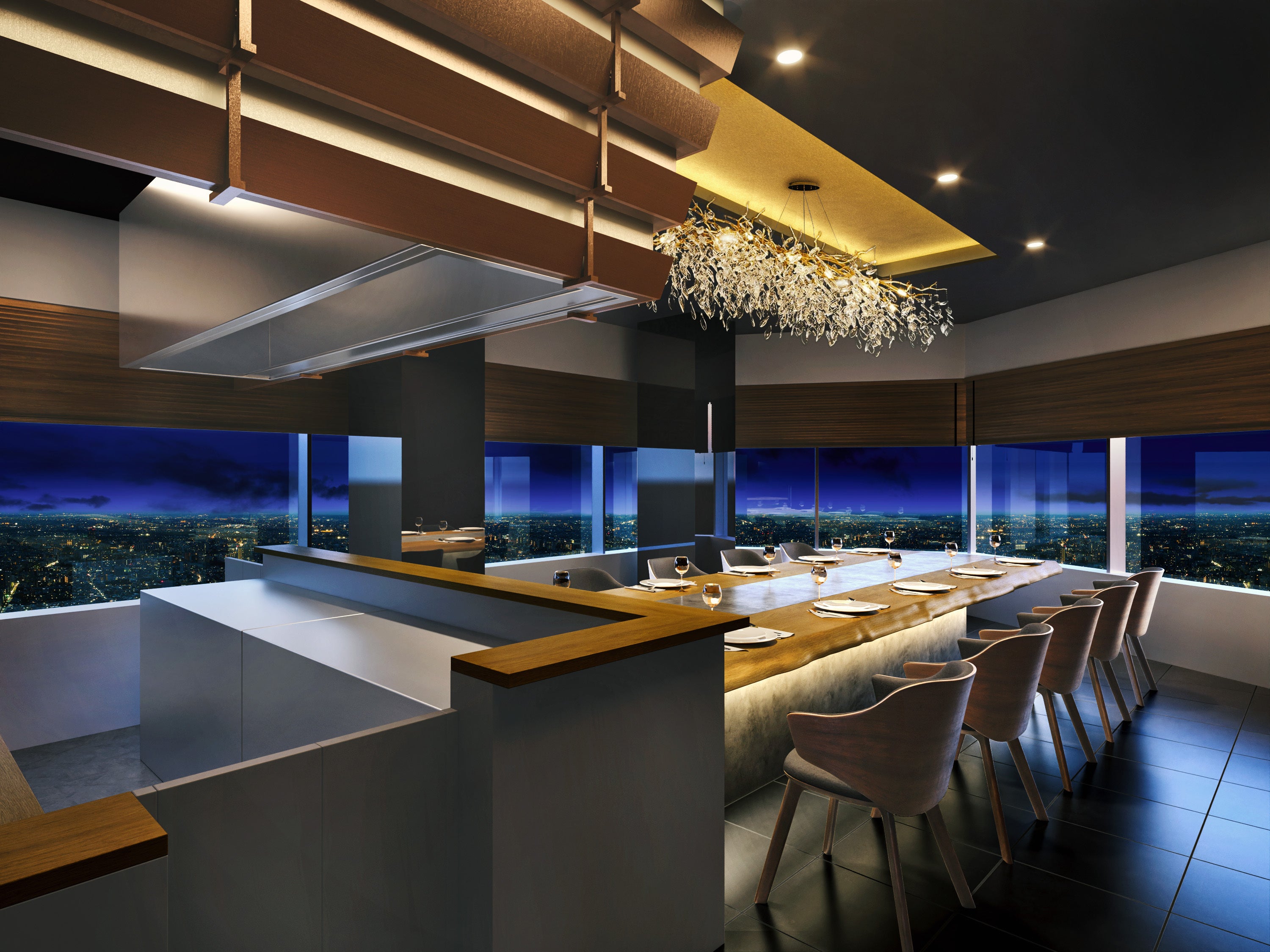 2006年7月アパホテル&リゾート〈東京ベイ幕張〉の開業以来、長きにわたりご愛顧いただいた鉄板焼「七海」は、今般の高層階 49 階移転リニューアルオープンを機に、高層階の解放感溢れる大きな窓から、眼下に広がる宝石のようにきらめく夜景や、雄大な東京湾を一望できる圧巻の眺望が望める店舗として新たに生まれ変わる。