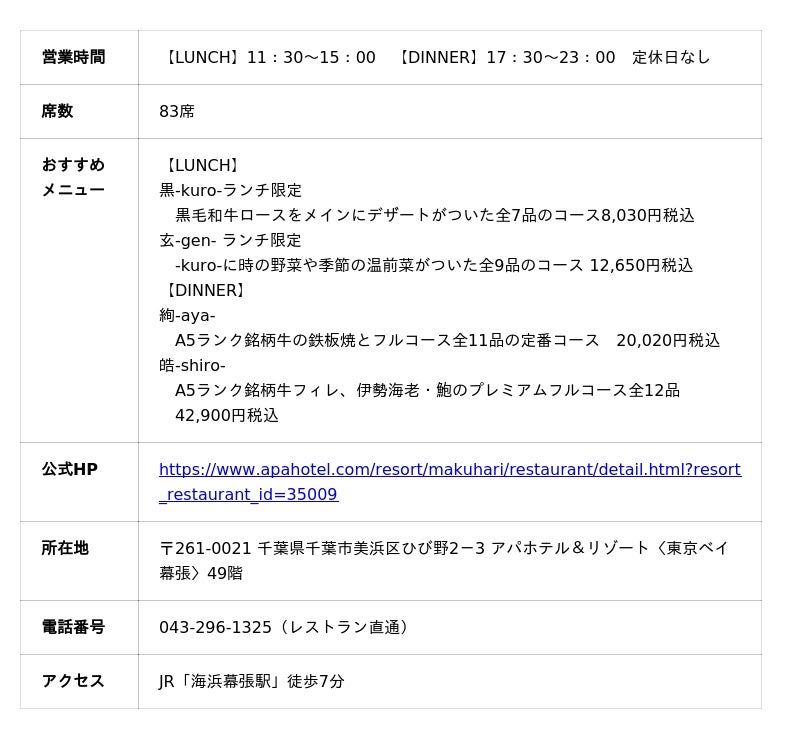 鉄板焼「THE 七海」公式HP:https://www.apahotel.com/resort/makuhari/restaurant/detail.html?resort_restaurant_id=35009