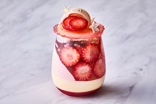 フレッシュな苺やムースなど、一番美味しくなる時期の苺をたっぷりと使ったスイーツです。中には、苺の味を引き立てる柔らかな甘みとレモンの酸味が合わさった“はちみつとレモンのゼリー”と、紅茶の豊かな風味と軽い苦みがアクセントになった“紅茶のゼリー”が入っています。下層のほのかな甘さが苺と相性のよい“マスカルポーネムース”と、甘酸っぱい“木苺のソース”が、最後まで飽きさせず全体をさっぱりとした味わいにまとめています。華やかで可愛らしい見た目も楽しい逸品です。
