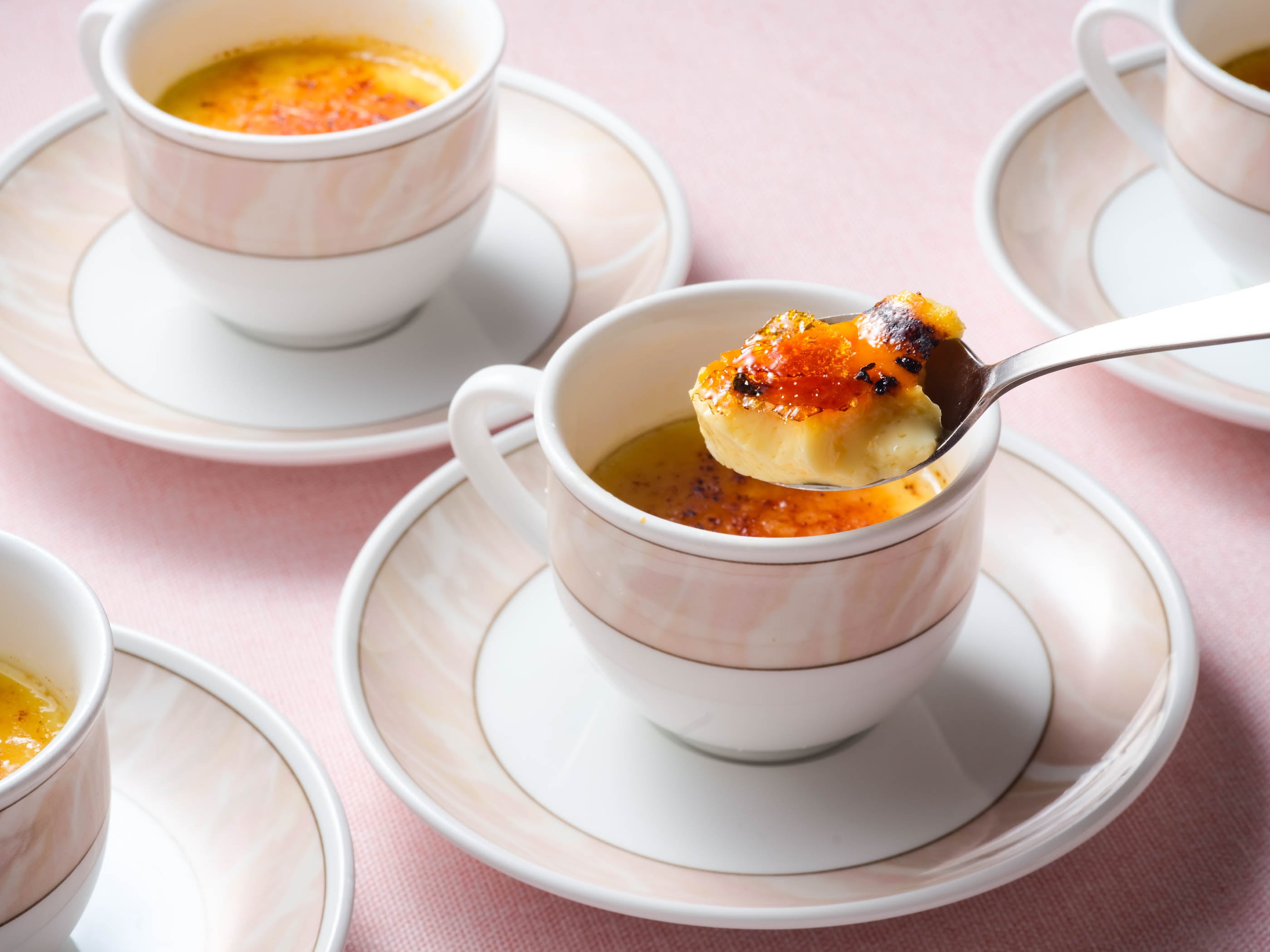 たのはた牛乳のコクをいかした、クレームブリュレです。上のカリッとしたキャラメルを割ると、中からとろっとしたクリームが広がります。シンプルながら満足感のあるデザートです。-お好みでイチゴを添えて(乗せて)