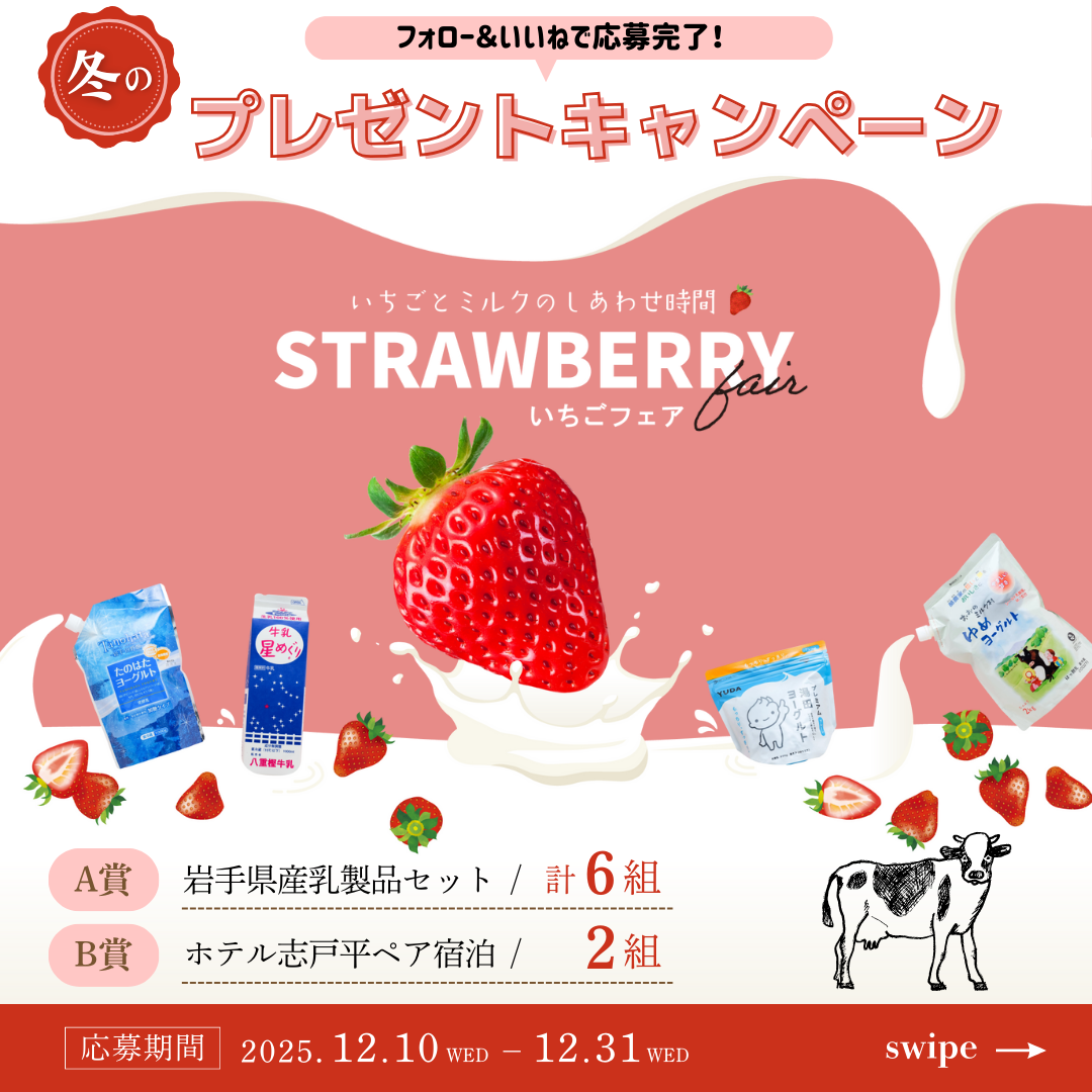 Instagramにて、プレゼントキャンペーンを実施中!各社公式アカウントフォロー&対象の投稿に「いいね」すると、抽選で、岩手県産乳製品詰め合わせセット(おおのミルク工房:2組・YUDAミルク:2組・(一社)田野畑村産業開発公社:2組)、湯の杜ホテル志戸平ペア宿泊ご招待(2組)が当たります!*応募期間:2025年12月10日(水)~12月25日(木)