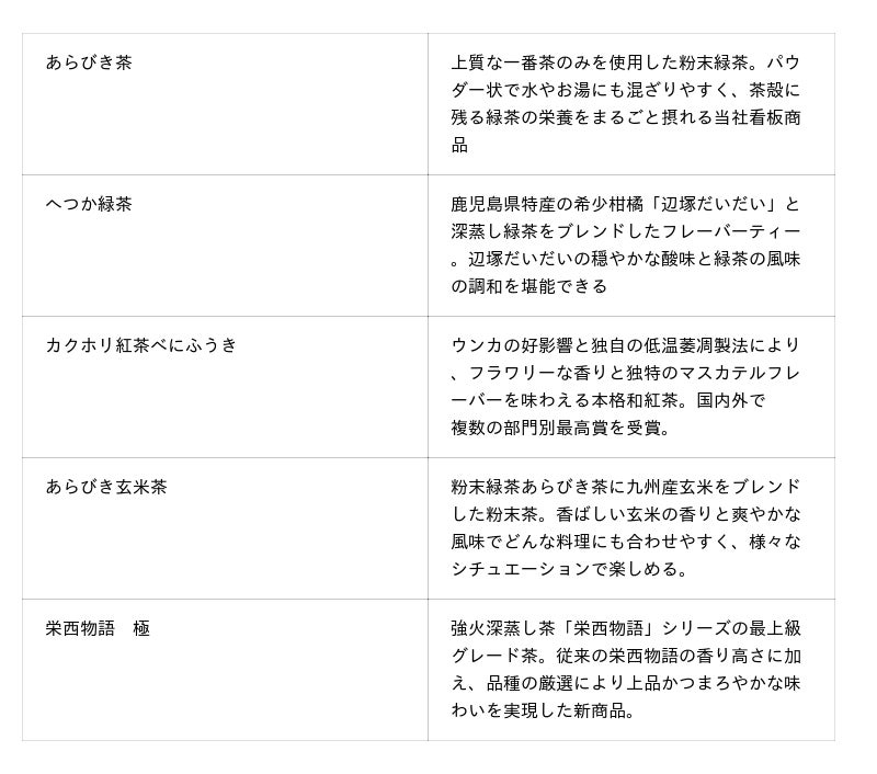 本物の緑茶の風味を様々な用途に活かせる粉末茶を求めて、自社の技術やノウハウを注いで開発した「あらびき茶」。“進化、深化、身化、心化”の思いを乗せ、“新たに挽いた(創出した)お茶である”という意味合いから“あらびき茶”と名付けました。