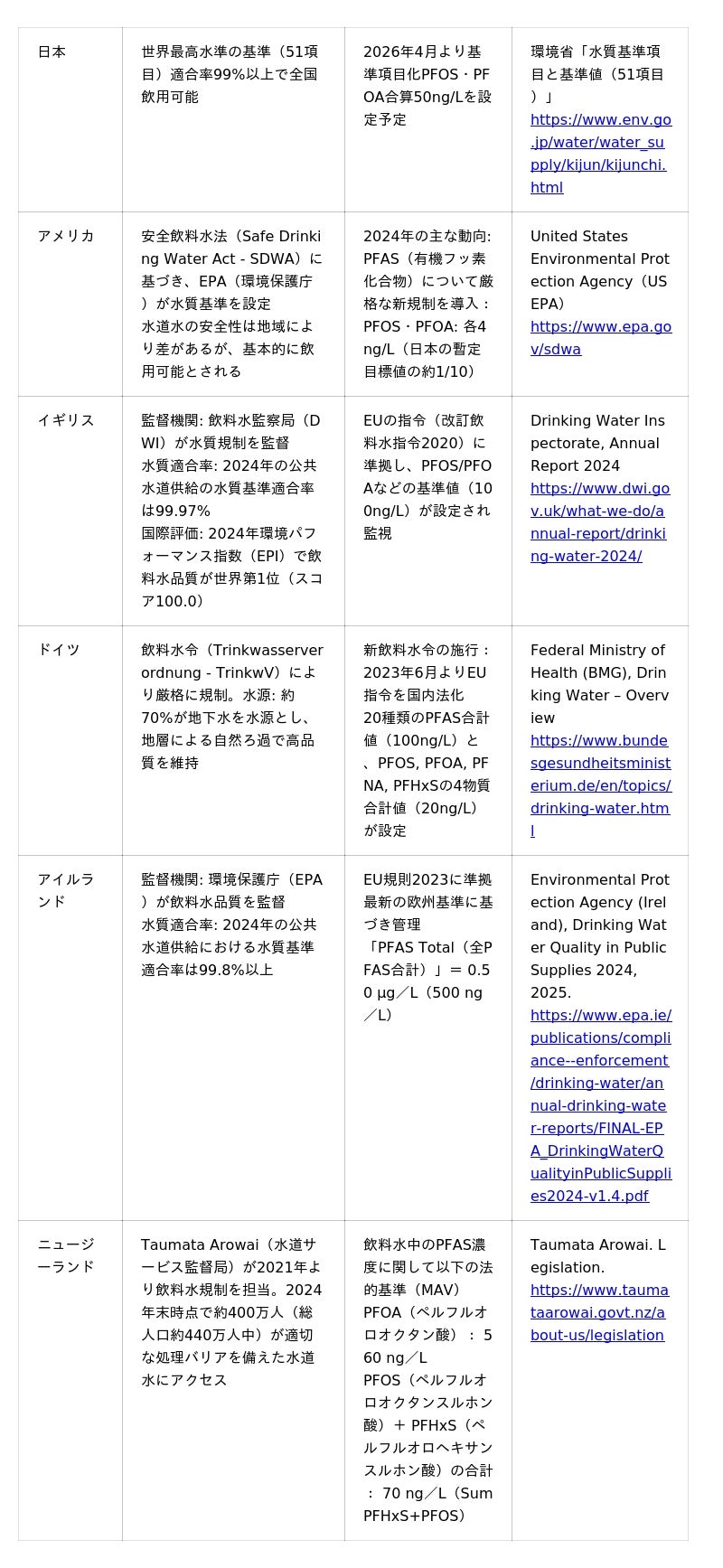 日本の水道水はWHO基準を上回る厳しい検査体制で管理され、世界でも数少ない「安全に水道水を飲める国」です。しかし近年、有機フッ素化合物(PFAS)と呼ばれる化学物質が世界的に問題視され、日本でも一部地域の水道水や地下水、河川などからPFASが検出されました。水の安全性が不安視されるなか、日本でも2026年4月の水道法改正で水質管理の基準がより厳格化される予定です(※2)。一方、天然水からもPFASが検出され事例も報告されており、「自然由来=安全性を保証」とは必ずしも言えなくなったいま、日常的に口にする水への正しい理解が求められています。