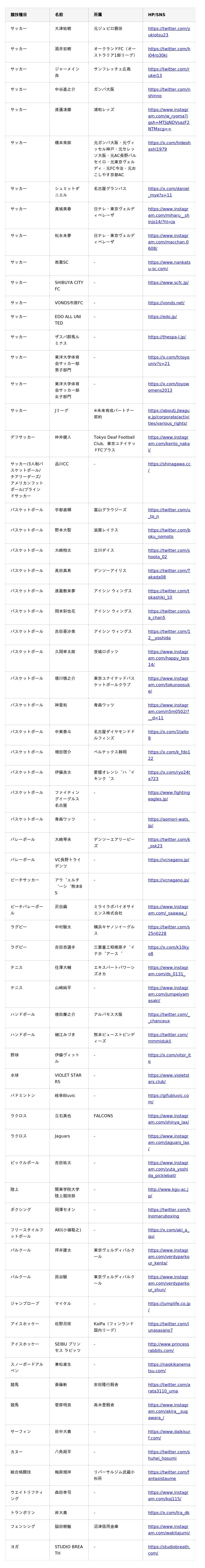<BASE UP SPORTS サプライヤー契約一覧(現時点)>