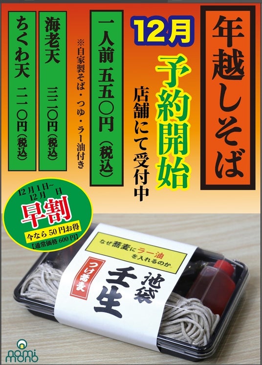 なお、現在、池袋壬生、なぜ蕎麦にラー油を入れるのか。全店、麺は組。全店 にて、1食分の年越し蕎麦の店頭予約受付 を行っております。