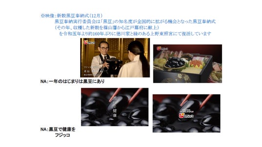 これらのリアルイベントとの連携を図るため、年末に放映している「丹波黒黒豆」のテレビCM を、これまでの商品訴求中心の内容から、当社の社会貢献活動である「食育活動の取り組み」と「和食文化継承活動」の紹介を軸とする、公共性の高いCSR 広告に変更いたします。