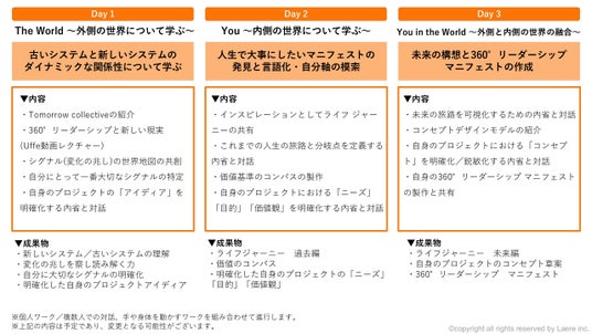 「外の世界」と「自らの内面」とを往復しながら、自分らしいリーダーシップを自組織や社会、日常生活の中で具体的に発揮していくための、実践的かつ内省的な3日間です。