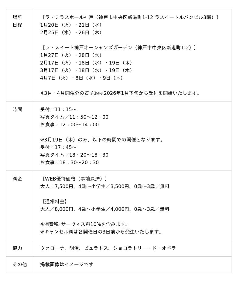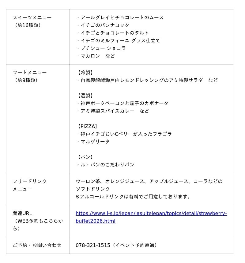 イチゴとチョコをふんだんに使ったスイーツのほか、会場から臨む神戸港の風景と「レストランカフェテラス アミ神戸(同ビル2階)」で人気を博しているピッツァをはじめとしたフードもお愉しみいただけます。