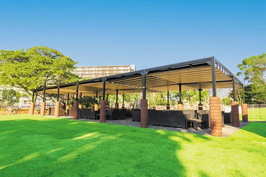 従来のラインナップよりもさらに大型化し、1基で25平方メートルの屋根空間を創出。柱の本数を抑えつつ、ゆとりのあるテラス席やイベントスペースを確保できます。