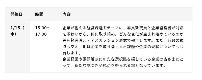 都市圏の中核人材を「客員研究員」として受け入れ、新サービス開発などの新規事業の創出やDXの推進といった経営課題を抱える県内企業とマッチングし、マッチング先企業にて経営課題解決を行う広島県内初の取組です。客員研究員は2025年10月から2026年3月までの半年間、広島に住みながら、週4日は企業で経営課題の解決に従事し、週1日は叡啓大学のゼミを受講し、企業及び自身の付加価値づくりに挑戦します。2 公開ゼミ概要