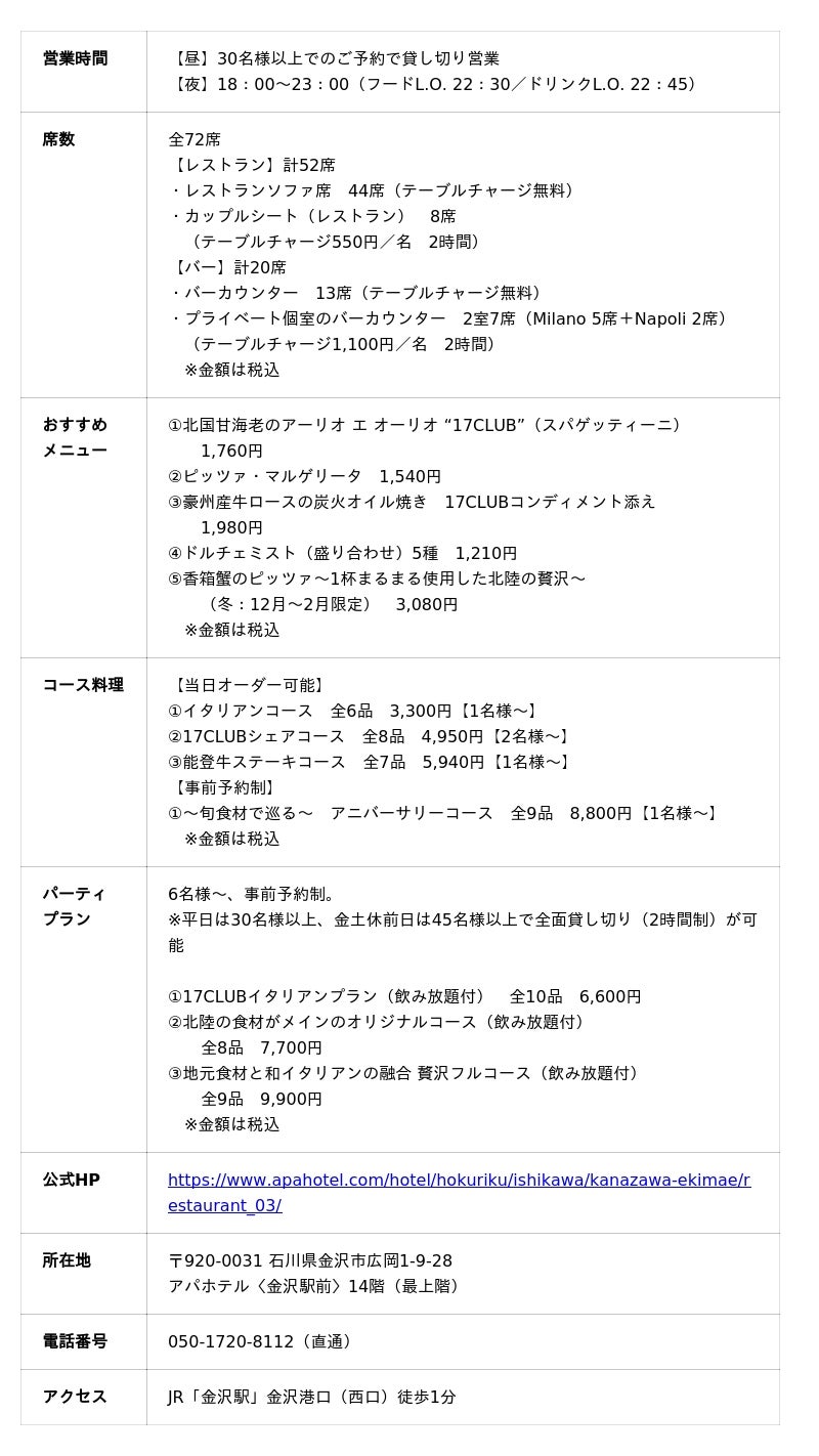 1998年4月、アパホテル〈金沢駅前〉と同時にオープン以来27年間、「レストラン&バー アルカンシェール」として営業を行ってきたが、今般のフルリニューアルを機に、“和”と“海外インテリア”の美意識を融合したハイブリッドデザインの空間で、北陸や石川県のご当地の食材を活かしたイタリアン料理や北陸クラフトジン、能登ワインをはじめとした地元の名酒や各国のウィスキー、カクテルを夜景とともにカジュアルに愉しめる店舗へと生まれ変わる。訪日旅行者の舌を魅了し、地元の方に誇りを持ってご利用いただける世界に通じる店舗を目指して、スポーツ界数々のスターの背番号17にあやかって店舗名を“17CLUB”と名付けた。