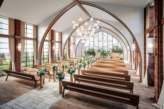 木の温もりと正面のステンドグラスの輝きが、ふたりの誓いをやさしく包み込みます。