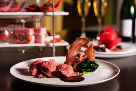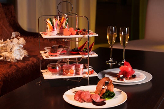 高層階からのきらめく街並みを眺めながら、ソファでロマンティックにお寛ぎいただけるハイティーをご用意しました。三段式のティースタンドには、鹿肉リエットとフランボワーズをサンドしたハート形のサブレや、いちごと生ハムを包んだホワイトチョコレートクリームサンドウィッチなど、オードブル感覚でお召し上がりいただける8種類のセイボリーが並びます。メイン料理は、宮城県栗原市産の黒毛和牛をジューシーに焼き上げ、カカオ香る赤ワインソースと根セロリのピューレで深みを添えました。締めくくりのデザートは、ラズベリーとライチのソースで艶やかに仕立てたチョコレートムース。赤い飴細工がきらめく姿に、心が華やぎます。また、ドリンクはスパークリングワインやチョコレートを使ったカクテルなど、多彩なラインナップをフリーフローでお楽しみいただけます。