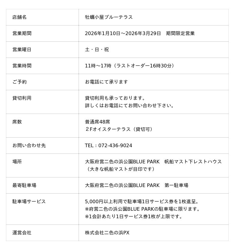 大阪府営二色の浜公園 BLUE PARK(店舗運営:株式会社二色の浜PX)は、二色の浜公園 帆船マスト下レストハウスにて、期間限定の牡蠣小屋をオープンいたします。
