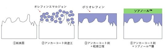 このたび当社が開発した技術は、紙基材にソアノール(TM)溶液とアンカーコート剤を併用して塗工することで安定したバリア層を形成し、ソアノール(TM)の優れたガスバリア性や耐油性を付与することができます。