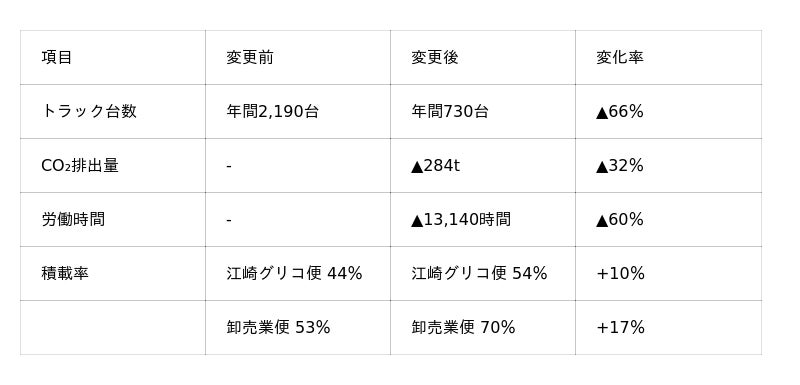 この結果、静岡方面に直接配送するトラックの台数を1日6台から2台に削減し(年間▲66%)、CO2排出量を32%削減し、労働時間を60%削減しました。
