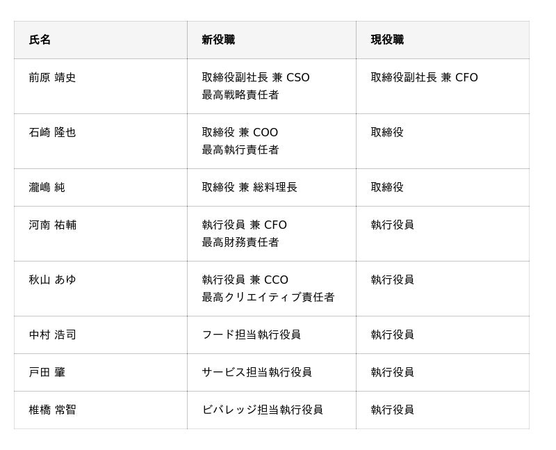 このたび、前原靖史が取締役副社長 兼 CSO(最高戦略責任者)に就任するとともに、石崎隆也が取締役 兼 COO(最高執行責任者)、瀧嶋純が取締役 兼 総料理長、河南祐輔が執行役員 兼 CFO(最高財務責任者)、秋山あゆが執行役員 兼 CCO(最高クリエイティブ責任者)に就任いたしました。あわせて、フード、サービス、ビバレッジの各領域を統括する執行役員体制を整備し、専門領域ごとの責任と連携を一層強化しております。