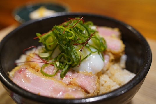 追加トッピングの九条ネギの香味だれが食欲を刺激し、定食としても、夜のお酒のお供としても楽しめる一品です。