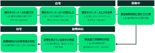 - 猫を動物病院に連れていく前~連れて行ったあとまでの各フェーズで飼い主が抱える様々なお悩みが明らかに